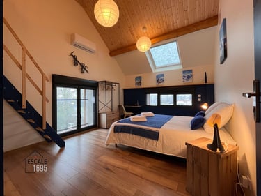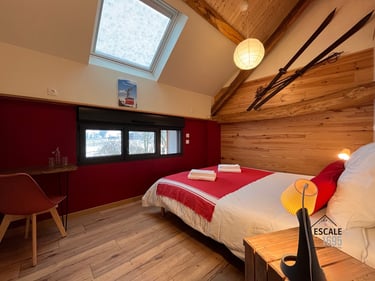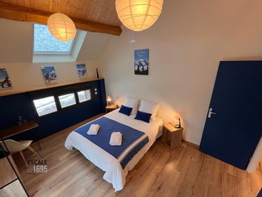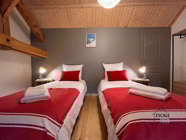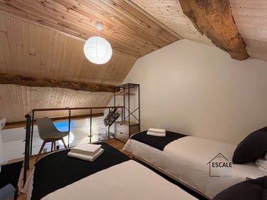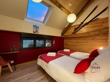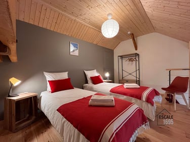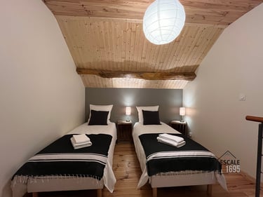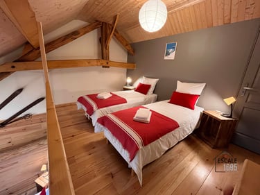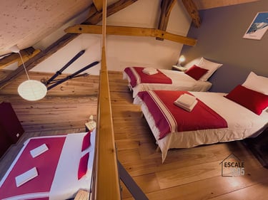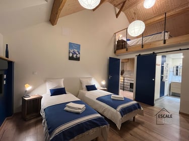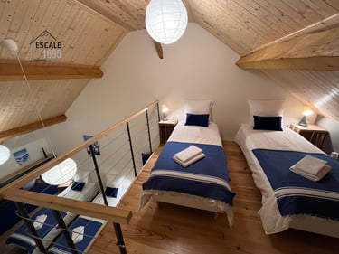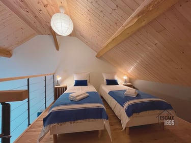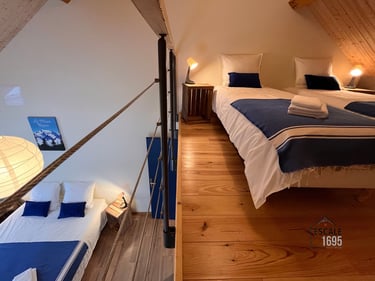 Chambre de 20m2 avec 2 espaces nuit : un lit twin de 2 x 80 x 200 et en mezzanine 2 lits simples 80 x 200 (pouvant être configurés en lit twin).