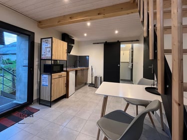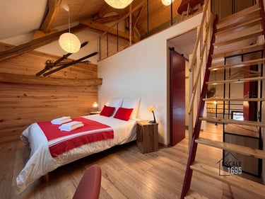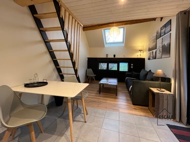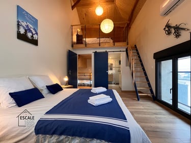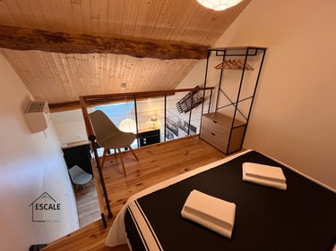 Chambre de 30m² avec un coin nuit en mezzanine et un espace salon (comprenant un canapé convertible en 160 cm) ainsi qu'un coin cuisine lors d'une location de cette seule chambre.