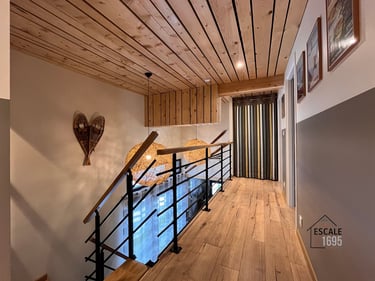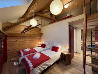 Chambre de 25m2 avec 2 espaces nuit: un lit twin de 2 x 80 x 200 et en mezzanine 2 lits simple 80 x 200 (pouvant être configurés en lit twin)