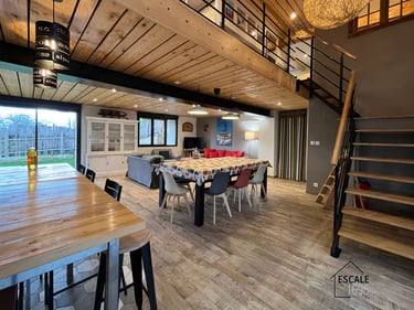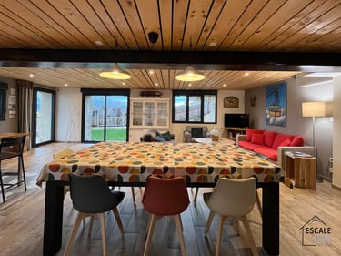 Espace partagé de 55m², avec un coin repas, un coin salon, et une cuisine