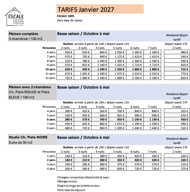 Nos tarifs 2027 incluent les charges, le linge de maison et le ménage de fin de séjour, afin de vous garantir un séjour sans contrainte. Vous trouverez ci-dessous le détail des périodes et des tarifs selon la saison.